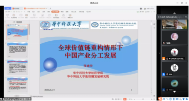 上半场主题会议的最后一位发言人是张建华教授,他报告的主题是《全球价值链重构情形下中国产业分工发展》。张教授在中美贸易战的背景下,着重分析了全球价值链重构的挑战,认为产业层面面临高端封锁”与“低端锁定”双重夹击。他认为,跨国公司利用国际经贸规则的主导权不断强化竞争优势,吸引高端制造业回流,加强服务价值链与制造价值链的融合,使我国产业向高端攀升的难度增大。在企业层面,我国本土跨国公司刚刚崭露头角,距离全球性公司还有很大差距,微观基础支撑的缺失将直接影响到我国在全球价值链重构上的话语权。为此,他认为中国还有几点需要努力:一是打造中国主导的全球价值链领军企业,二是完善全球价值链的配套服务体系,三是加快构建双循环相互促进的新发展格局,四是积极参与全球贸易多边治理。