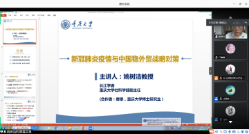 姚树洁教授以新冠肺炎疫情为背景,作了题目为《新冠肺炎疫情与中国稳外贸战略对策》的研究。其研究内容分为三个部分,一是疫情暴发时间线,二是全球疫情对中国国际贸易造成的危机,三是在危机中寻求机遇、稳外贸战略对策。顺着中国、美国、全球疫情暴发的时间线,他指出全球疫情会给中国的复工复产、供给侧、需求侧产生威胁。由此出现的贸易摩擦升级、逆全球化与“去中国化”的现象不容忽视。面临全球性危机,他给出的政策建议:一要展示大国形象,夯实信赖基础,强化国际合作;二要调整产品方向,适应需求变化,保住发达国家市场不丢失;三要加强贸易和投资分化,减轻对发达国家市场的依赖;四要充分调动和刺激内需消费;五要利用好全球抗疫时间差,推动全局性的产业结构优化。