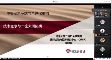 鞠建东教授从技术竞争、二流大国陷阱、如何跳出二流大国陷阱三个方面阐述,进行了以《技术竞争与二流大国陷阱》为主题的演讲。第一部分鞠教授将技术分为渐变型技术和突变型技术两大类,认为不论是哪种技术,追赶国家在技术竞争中完成“蛙跳循环”需要满足相应的条件,即满足条件后技术领先可以在两个国家中交替出现。第二部分他具体介绍了二流大国陷阱的定义和产生的原因,大国领先地位循环更迭出现中断的现象被称为“二流大国陷阱”,产生原因在于国家之间的技术竞争中,技术追赶国家无法对技术领先国家实现超越。第三部分他以中美技术竞争为例,针对异质性产品和异质性需求、第三国效应,认为继续保持足够高的研发投入水平和与其他国家在技术领域和合作,可最大程度地向其他技术领先国家学习技术,维持高技术在国家间最大程度的扩散,进而能够跳出“二流大国陷阱”。