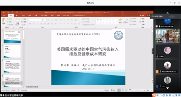 彭水军教授作了以《美国需求驱动的中国空气污染转入排放及健康成本研究》为题的演讲。他认为在中美贸易摩擦不断升级的背景下,鲜少有人关注中国付出的巨大隐性健康成本,即空气污染物的转入排放使得中国居民健康水平下降的现象。他通过多区域投入产出模型(MRIO模型)、GEOS-Chem化学传输模型及暴露-反应模型(IER模型)的分析,发现美国需求引致的八种空气污染物通过空气流通在中国的空间分布呈现出“胡焕庸线”的特点,即空气污染严重的地区集中在“黑河-腾冲一线”以东。该研究还发现,2012年美国需求引致中国排放的空气污染物使中国各个地区空气中PM2.5的浓度上升约0.2%-2%;中国由于满足美国需求导致PM2.5浓度上升而死亡的人数为13996人,占由于PM2.5导致的全国死亡人数的1.06%。