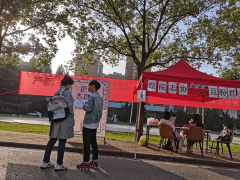 经院志协的干事们通过发放宣传单以及讲解的形式对经院志协的活动进行宣传,以便同学们更全面的了解相关活动的内容以及形式。不少同学也主动来到咨询点并积极询问,充分展现了当代青年应当具备的公益心以及社会责任感。中午12点过后,摊位在多位干事的协作下成功搭建,吸引了更多的同学前来询问,干事们抓住机会,热情地解答同学们的疑问并介绍相关活动。有的干事还穿上了熊本熊的衣服,争取吸引更多的同学前来了解。图书馆前、宿舍楼下、快递站点,处处可见干事们那声情并茂宣传的样子。虽然干事们是第一次举办活动,但也办得有声有色。