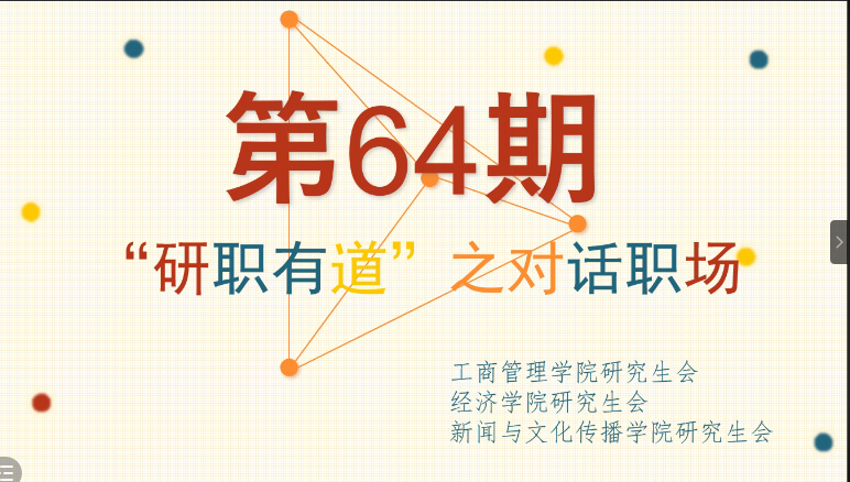 (通讯员:任一诺)2020年11月28日下午2点到4点,第64期“研职有道”—知己知彼,对话职场线上讲座通过腾讯会议成功举行。此次活动由中南财经政法大学研究生院、党委研究生工作部、中南财经政法大学研究生会主办,工商管理学院研究生会、经济学院研究生会和新闻与文化传播学院研究生会共同承办。