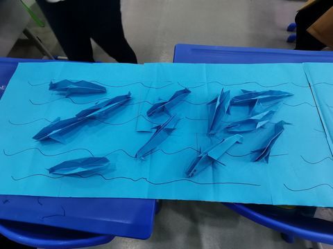 (图1:孩子们画鲸折鲸感受鲸鱼魅力)