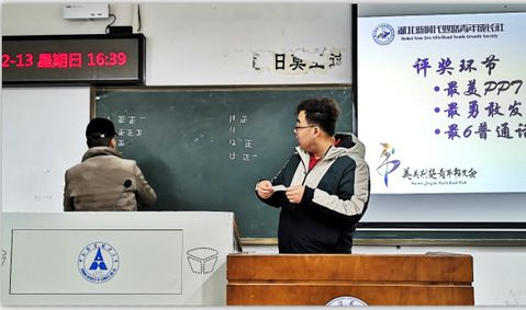 13名分享者分享完毕后,艾合买提老师进行简单点评,并收取在场同学的投票,公平公正进行计票工作,最终选定了一名“最美PPT”奖项得主、两名“最勇敢发言人”与一名“最6普通话”奖项得主。