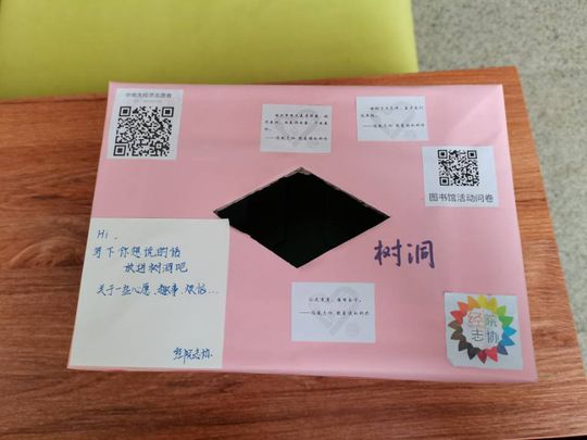 在活动举办前期,活动小组成员共制作了25个小立牌、3个大立牌和3个新的树洞,在这些新的物资上都粘贴了经院志协标志、中南大经济志愿者QQ二维码、暖心话语以及图书馆活动的调查问卷二维码随后,活动小组成员将这些新的物资摆放在图书馆二楼大厅休息处和自习室内,同时在阅览室和流通书库内更新了共享书单歌单和电影推荐的内容,确认物品全部摆放整齐后,活动顺利结束,活动小组成员一起离开了图书馆。