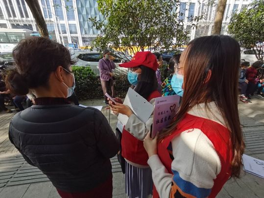 随着时间的流逝,小朋友们的放学时间快要到了,围在校门口的家长也多了起来,小组成员们礼貌地上前询问。在询问过程中,部分家长表示家教地点离家远或是小朋友们已经有课外辅导班而拒绝了小组成员,但成员们丝毫没有气馁,继续耐心地向一位又一位的家长介绍我们的活动。在小组成员的努力下,不少家长都加入了家长群。