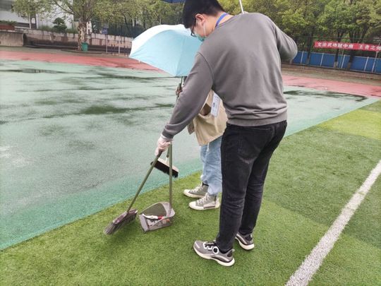 (图2:活动成员合作清扫操场上的垃圾)