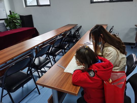 活动当天,活动小组成员们分为两组分别前往两个活动地点,小组到达后均被告知之前联系的负责人不在,如果无法提供相应证明,就无法使用活动场地。好在成员们之前留有负责人的联系方式,且到达时间较早,这个小插曲才没有影响到家教活动的进展。千家街的小组成员们按时接到了来参加活动的小朋友,在跟小朋友的家长确定了小朋友需要完成的作业和回家的时间之后,便开始辅导起小朋友。小朋友乖巧活泼,认真地写着自己的作业,在遇到问题时也大胆询问,成员们也耐心温柔地解答了小朋友的疑惑,并适时点出作业上的错误,很快小朋友便高效地完成了作业。在之后等待家长来接小朋友的时间里,小组成员们与小朋友聊了许多话题,从自己的兴趣爱好到在学校的生活再到有趣的脑筋急转弯,小朋友与成员们的距离迅速拉近,成为了较亲近的朋友。