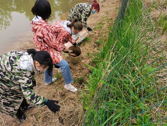志愿者们于13点到达武汉田园小动物保护中心,并穿戴好志愿者服装与手套。在高站长的安排下,志愿者们首先进行施肥保护幼苗的任务。志愿者们分成两组,一组用铲子将肥料倒在土豆苗的周围,另一组用手将枯草围在土豆苗的周围,并堆到一定高度。天气有些阴沉,雨淅淅沥沥下着,鱼塘边的土壤变得更加湿润。但志愿者们仍然细心地劳作,为这些幼小的土豆苗提供营养与保护。在高站长的提示下,志愿者们顺利地完成了施肥保护幼苗的任务。