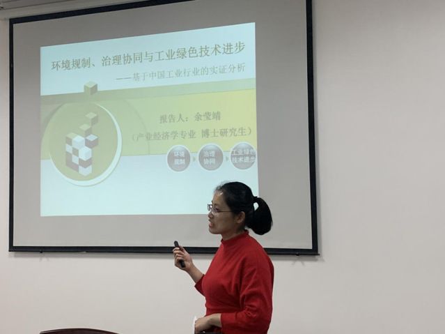 第五位汇报人是来自中南财经政法大学的余莹靖,论文题目为《环境规制、治理协同与工业绿色技术进步——基于中国工业部门的实证分析》。文章基于2001-2015 年中国 33个工业行业数据,运用中介效应模型,发现环境规制通过治理协同促进了工业绿色技术进步。并且环境规制对工业绿色技术进步的影响会随着区域间治理协同水平的变化而发生实质性变化。评议人肯定了“协同治理”的文章亮点,同时指出“协同治理”的衡量指标选取可以再思考。潘安副教授认为文章的文献梳理和假设设计可以进一步完善;孔令宇博士建议是否能够构建博弈模型来更好的表达协调治理的观点。