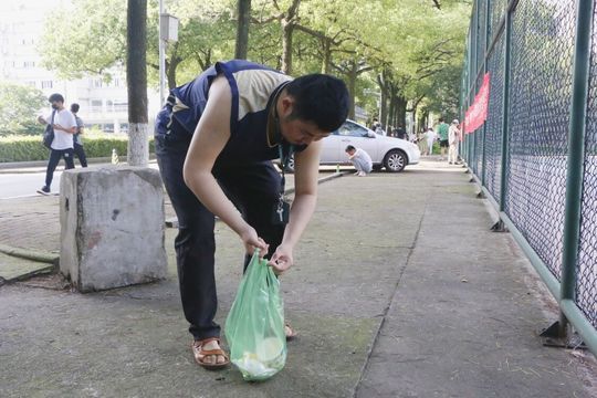 活动中,同学们利用领到的工具,秉持“不怕脏、不怕苦”的精神,认真捡拾校园垃圾,将发现的废纸、塑料放入自备的垃圾袋中,为学校环境优化献一份力。