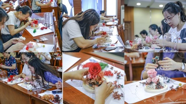 永生花又名“永不凋零的鲜花”,它是使用玫瑰、康乃馨等鲜花,经过脱水、烘干、染色等一系列程序加工而成的,以至于它既保存了鲜花的色泽,又能够达到长久保存的功能。永生花彰显了巾帼之美,也寓意祝愿中国共产党永葆青春、永葆活力。在花艺老师的指导下,女教师们将细心、用心、尽心的工作风格发挥得淋漓尽致,从聆听讲解、设计配色、选取材料到实际制作,每一环节都彰显了大家的妙手匠心,每一枝、每一朵花都体现了她们对美的热爱与向往。每位老师都把对党和祖国的热爱凝聚在了手中的永生花里,纷纷把自己心中最美好的样子呈现为作品,在灵感与创意的浇灌下,精致的永生花和愉悦的笑容竞相绽放,焕发出女性的无限魅力与风采。