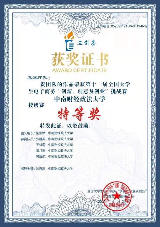 2020年,项目获得了大学生创新创业大赛省级立项以及“挑战杯”校级三等奖。2021年,在第十一届全国大学生电子商务“创新、创意及创业”省级赛中从4000多个项目中脱颖而出荣获最佳创业奖和特等奖,代表我们学校斩获湖北省“三创”特等奖“十强”,在挑战杯、互联网+等比赛中均有获奖。