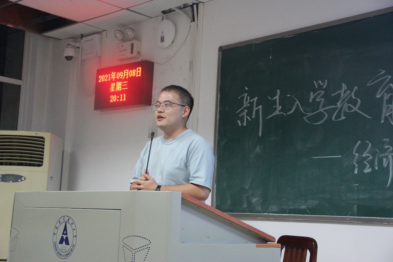 经济学院研究生会执行主席熊保维进行了新生防诈骗教育,通过十一种主要诈骗方式和相关案例提醒同学们时刻保持警惕,提高财产保护意识。