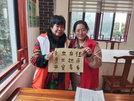 紧接着是本次活动的主要内容——“书法教学”隆重登场。“手挥墨笔恣欢意,砚落心底纸留香”,大朋友们在活动小组成员的悉心指导下,共同在宣纸上写下了自己心中美好的祝愿:“平安喜乐,万事胜意,自立自强,顺心如意”,最后还在纸上烙下了属于自己的印记。在薄薄的宣纸上,活动小组成员们仿佛能够看到一群折翼的天使对生活充满的乐观和希冀,看到独属于他们的耀眼光芒。