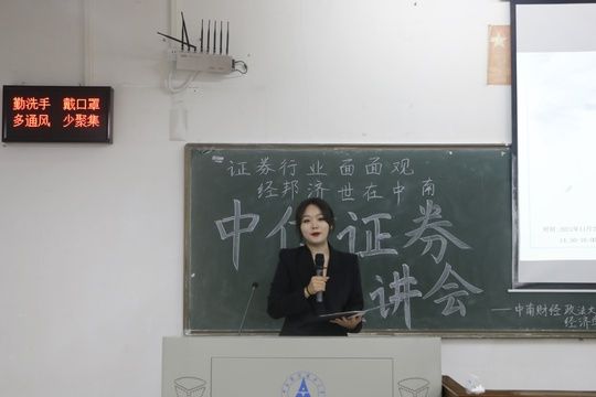 (学生记者郭宇航 摄影王学斌)为了加深同学们对证券行业的了解,明晰个人职业规划,经济学院“证券行业面面观,经邦济世在中南”主题宣讲会于11月20日下午2时30分在南湖校区文澜楼107教室顺利举办。本次宣讲会由经济学院分团委创业实践部承办,创业实践部学员李金诺同学主持,并邀请中信证券湖北分公司的陈蔚竹女士和何雅艺女士担任本次宣讲会的嘉宾,经济学院本科生代表到场参加本次讲座。