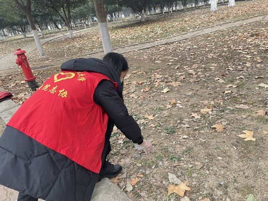 另一边,负责清理校园的小组成员们来到了各自负责的区域,捡拾校园内的垃圾。尽管校园每天会有专人负责清理打扫,但在草坪里、小路上、花坛角落内,总还是有一些烟头、纸屑之类细碎的垃圾的存在。小组成员们秉持着“不怕脏、不怕苦、不怕累”的精神,冒着寒风和毛毛细雨,一次又一次地弯腰,将沿途所见到的废纸、饮料瓶、包装袋、香烟头等垃圾捡起放入了塑料袋并统一倒入了垃圾箱中,为美化环境和绿色校园贡献出自己的力量。