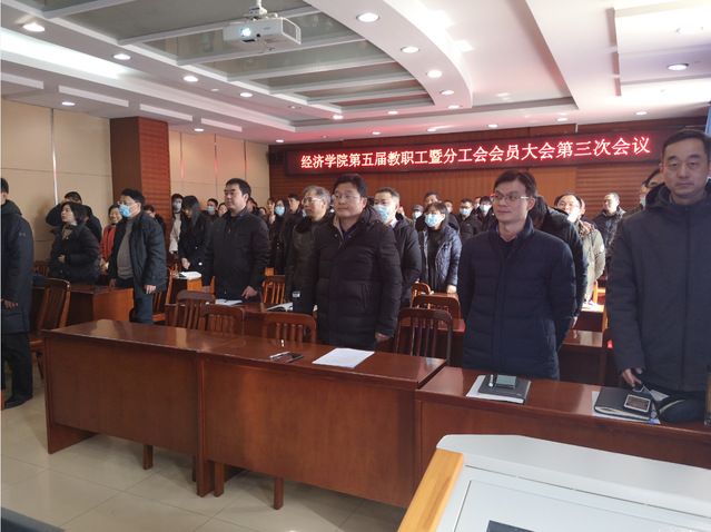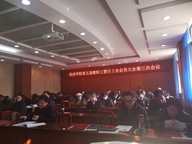 2022年1月13日下午13:30,经济学院在文泉楼南206会议室隆重举行第五届教职工大会暨工会会员大会第三次会议。出席本次的会议有经济学院院长李小平、院党委书记刘刚、副院长张鸿武、宋丽智、杨波、院长助理陈立兵、杨晓军、院党委副书记俞凡以及经济学院全体教职工,大会由教代会主任宋丽智主持。