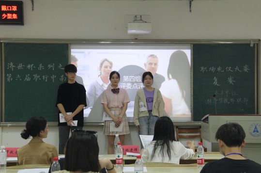 在选手展示后的点评环节,罗政老师和曹琳老师都对每位选手进行了中肯的点评。首先,由曹琳老师对每位选手的简历进行点评,从简历的照片、格式、经验等方面提出建议,帮助选手更好地理解如何制作简历。接着,由罗政老师点评每组选手在情景模拟中的表现,针对情景模拟的题目对每位选手提出个性化建议,从而帮助选手更好地在职场中处理问题。在这种激烈有序的氛围下,“济世杯”系列之第六届“职行中南”职场礼仪大赛复赛圆满结束。