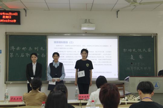 而后,每组选手依次上台,根据情景模拟题目进行职场情景模拟,在特定的情景中模拟不同角色在职场中处理问题。每组选手根据题目和要求展现了个人的礼仪素养、应变能力和逻辑能力,充分展现了个人风采。