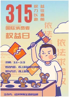 为了增强广大学生对消费者权益的认识,提高日常维权意识,学会维护自身权益,经济学院生活权益部于3月分别举办为期一个月的民主月活动和于13日进行的线上游园会。