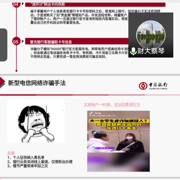 同时蔡女士还介绍了新型买卖银行账户诈骗的新形式,提醒同学们一定不可将本人闲置银行卡卖出获利。