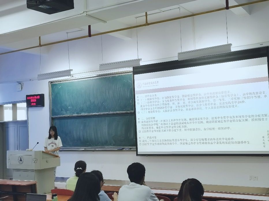 其次,2020级班委代表肖欣如同学通过评选条件、评选流程、综排计算、计分标准四个方面向各位班委全面讲述了奖学金评选的全部流程。其中,她主要向各班委介绍了作为班干部应该如何对奖项进行审核,并就以往经验总结了审核过程常见的几大问题及学院的认定标准,同时亲自演示了在系统上如何进行提交、退回等操作,帮助各位班委对评审细节有更清晰的认识。最后,由各班委提出审核过程尚未解决的问题,肖欣如同学及其余班委一同解答。