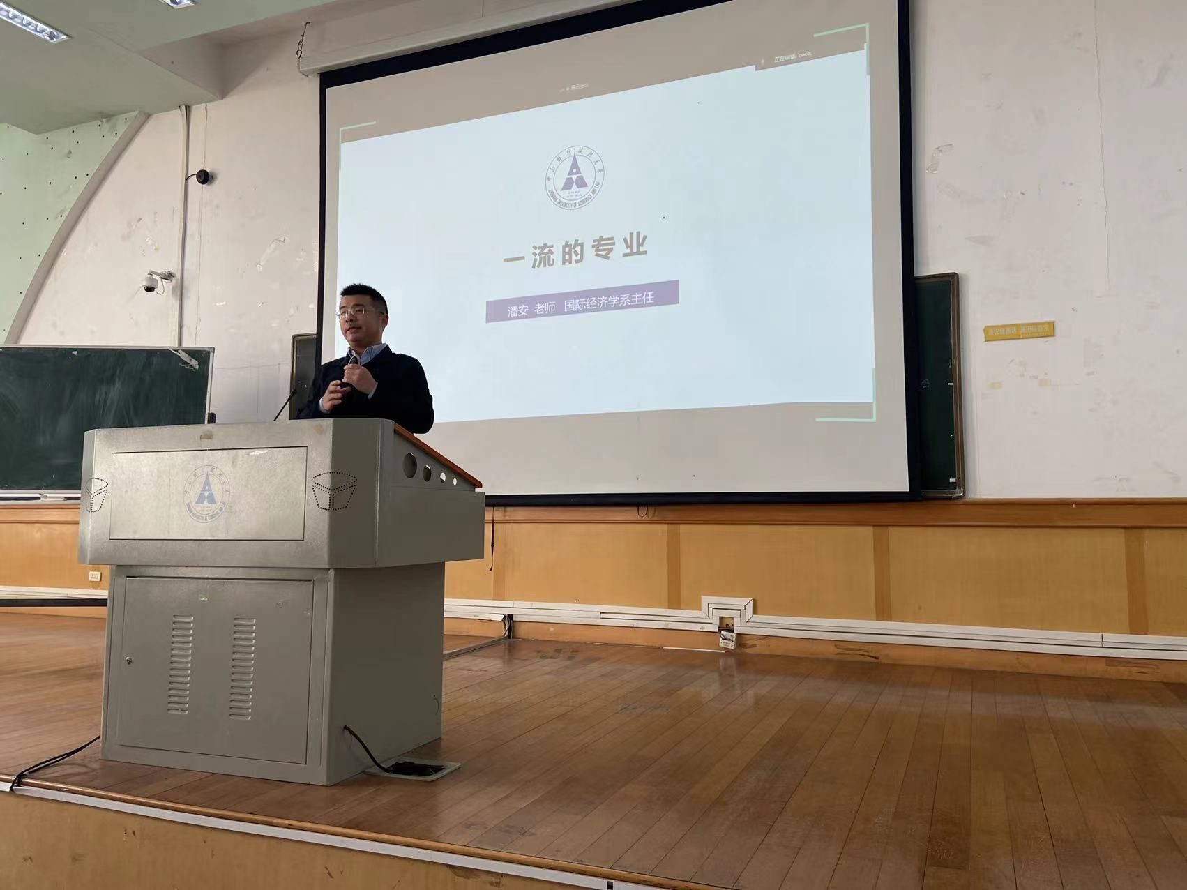 随后,国际经济学系潘安主任开始进一步介绍国际商务专业。他从国际商务办学特色等方面开始讲解专业,指出我院国际商务专业为国家级一流本科,同时提出要培养“懂经济、善管理、晓法律、通外语的复合型人才”。
