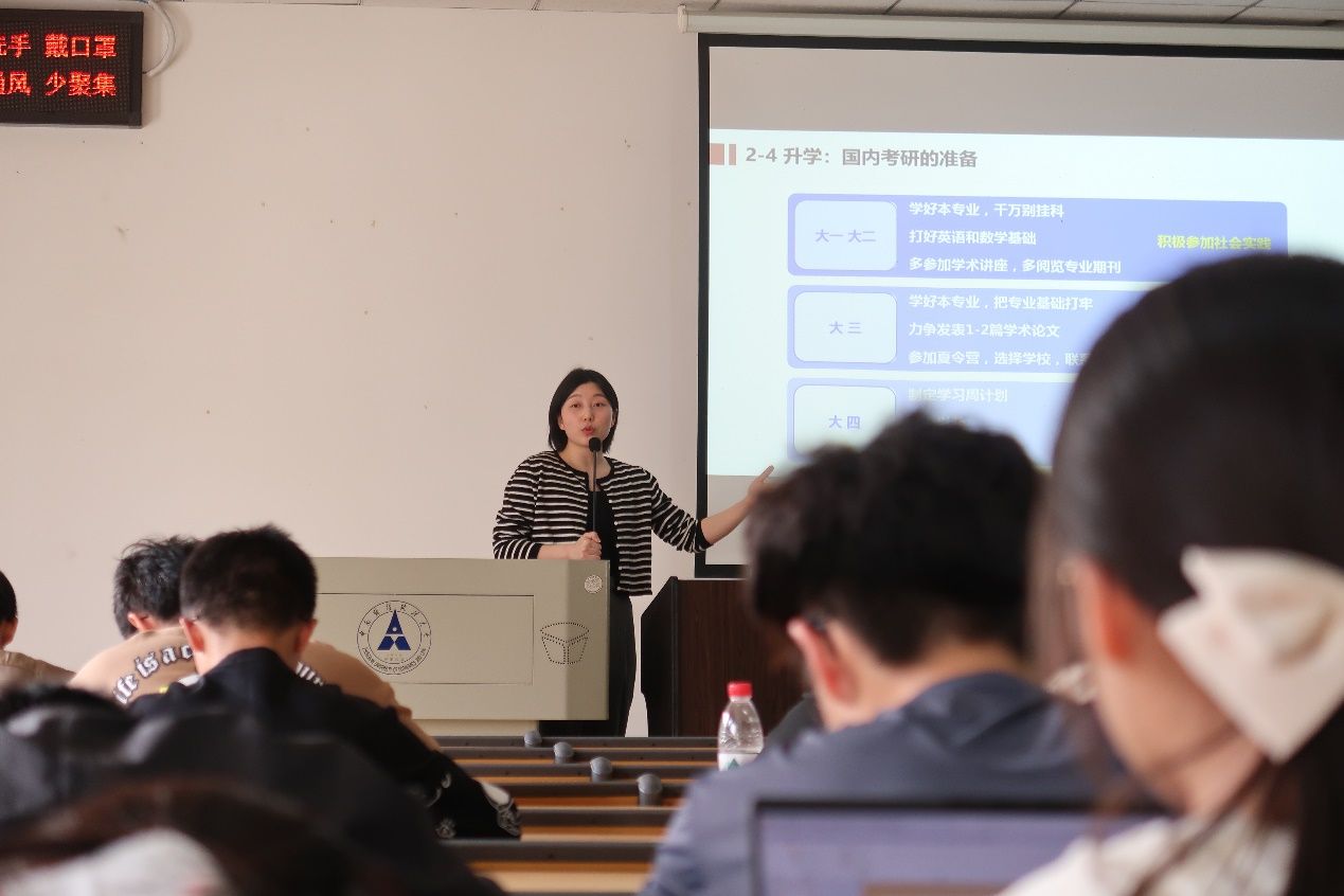 郭婉钰老师将本科生未来发展方向分为直接就业、升学和出国三个方面,进行毕业去向分析,使学生对未来规划有了初步认知。随后,郭老师分别从直接就业、升学和出国三个方面入手,为学生介绍校园就业资源,提供就业资源查询途径,引导学生进行升学规划和出国留学规划,传授宝贵经验,使学生对未来规划有了详细了解。