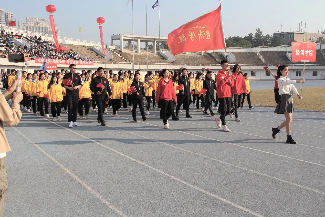 入场式中经济学院方阵在全院老师和同学们的大力支持下,由学院领导亲自带队,伴随着恢弘的音乐,昂首阔步,自信入场。10点整,比赛正式拉开帷幕。