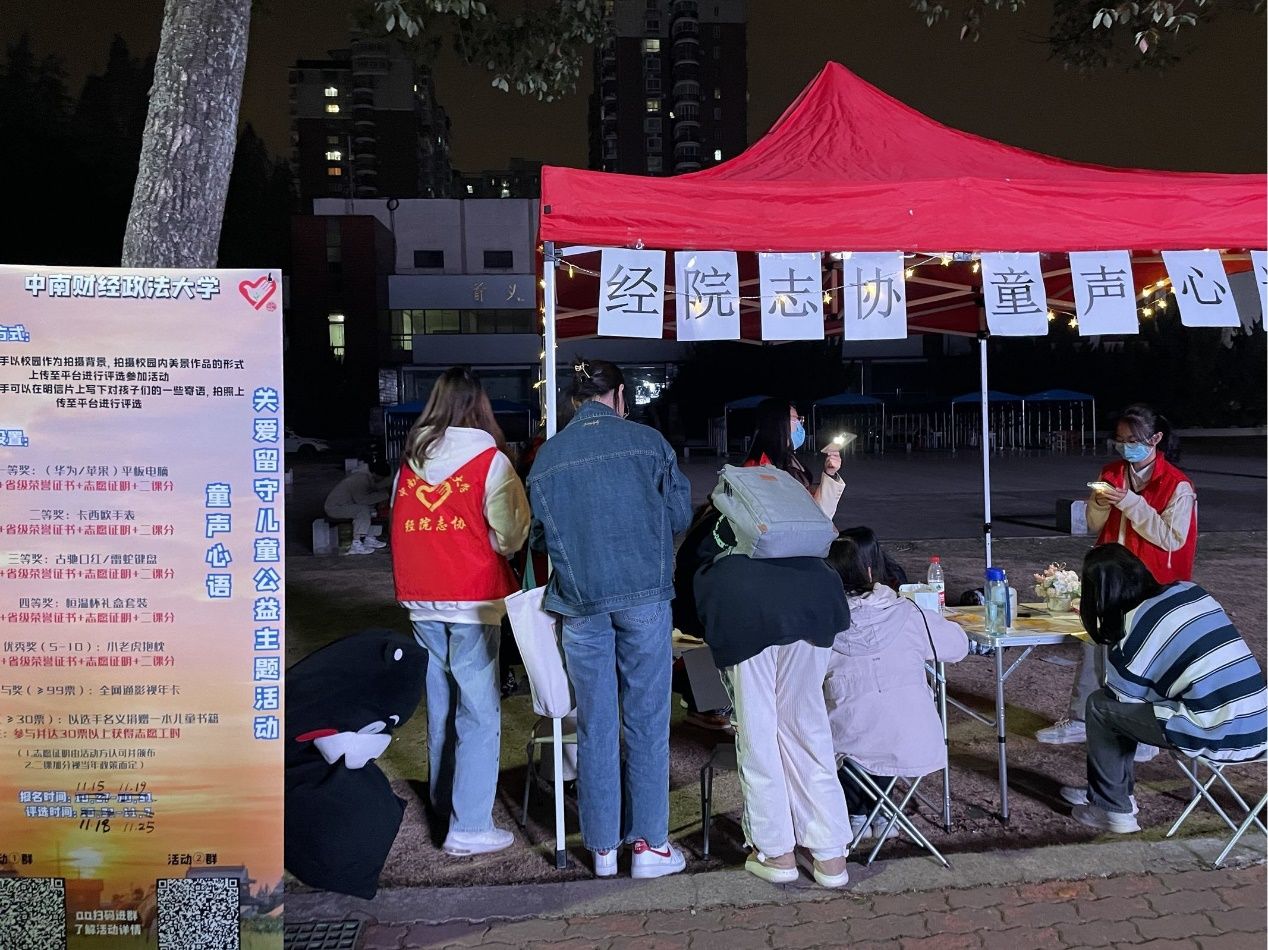 (通讯员:徐婧)有这样一群孩子,他们远离城市的繁华,缺少双亲的陪伴,拥有着对爱的渴望,他们就是留守儿童。为了给山区的留守儿童们送去祝福与关心,乐鱼官方端网站登录入口志愿者协会(以下简称“经院志协”)的成员们于2022年11月17日下午4点准时于首义校区图书馆前开展“童声心语”活动,本次活动于晚上7点圆满结束。