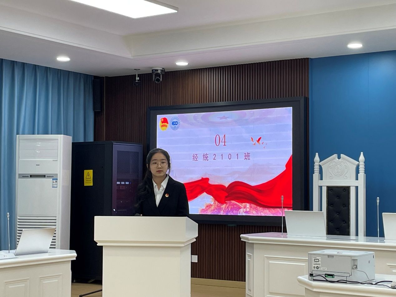 (学生记者王若瑄 摄影曾昊)为学习宣传贯彻党的二十大精神,引导青年学子踔厉奋发,坚定理想信念,11月19日下午,经济学院“青春献礼二十大,同心筑梦新开元”主题团日活动设计大赛在南湖校区文泰楼模拟法庭顺利举办。为积极配合学校疫情防控相关要求,减少校区间人员流动,本次比赛特于首义校区文津楼401教室设置分会场同时进行。经济学院分团委陈远瞻老师及金融学院、公共管理学院、统计与数学学院、新闻与文化传播学院等五院分团委副书记在南湖会场参加活动并担任评委,经济学院学生工作办公室主任周琼老师,2022级班级导师潘峣老师、郭厦老师及新生班助肖欣如在首义会场参加活动并担任评委。曾昊扬、杨怡潇同学担任主持人。经济学院2021及2022级各班同学代表到场赛。