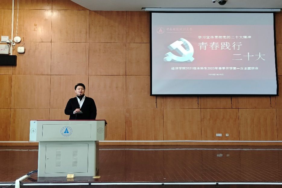 (学生记者 王学斌 摄影 郭宇航)新学期,新气象,为进一步加强学习宣传贯彻党的二十大精神,帮助同学们更快、更好适应新学期的到来尽快恢复学习状态,经济学院在全院本科生中开展“青春践行二十大”主题教育系列活动。 2023219日下午,2021级本科生率先在南湖校区文泰楼321室召开了主题班会, 2021级本科生辅导员陈远瞻老师主持会议,2021级本科生全体到场参会。