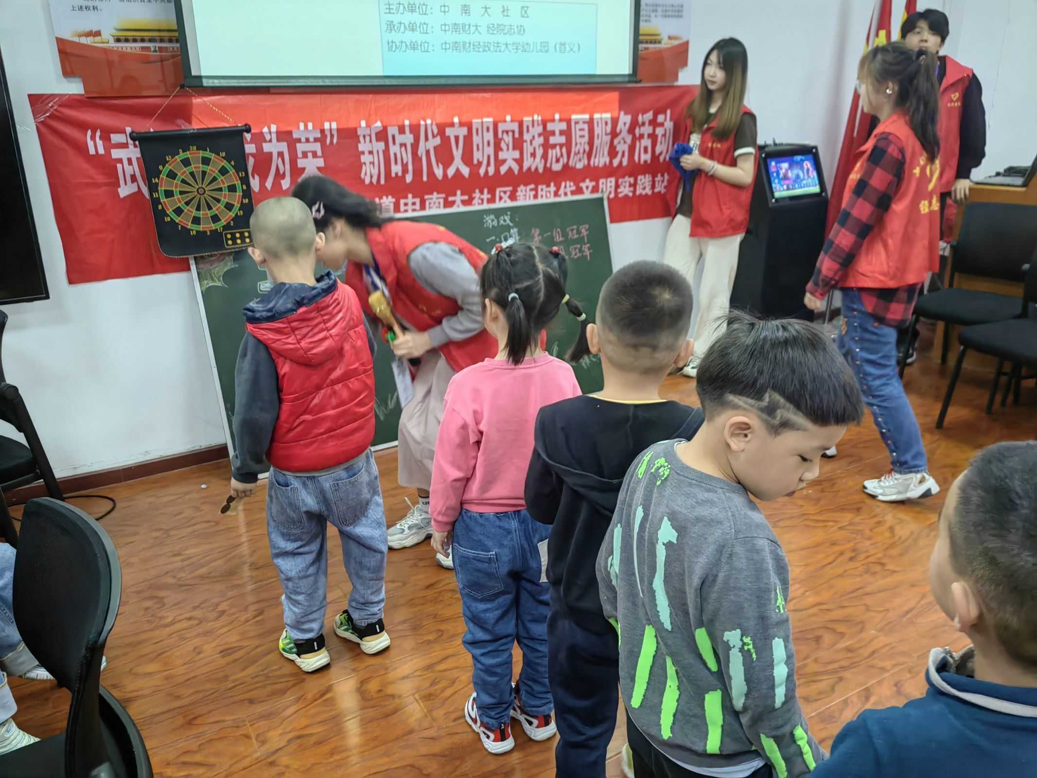 活动当天,经院志协的志愿者们早早到达活动地点,有条不紊地布置场地、调试设备,在老师的指导下到门口做好迎接小朋友们的准备工作。热烈欢迎小朋友们进场后,活动正式开始。志愿者将小朋友们分成三组,采用积分制进行十五轮加减法抢答。接着,小朋友们组内分工,在聆听志愿者们的规则介绍后,积极参与投壶、飞镖等游戏,赢取小奖品。在三轮激烈的比拼后,志愿者们带领小朋友体验了上个世纪的回忆“搅搅糖”和中国传统剪纸、折纸艺术,领悟中国传统之美。随着教室里童趣的音乐逐渐消失,本次活动也进入尾声。志愿者们给小朋友们颁发了“投壶冠军奖”“飞镖冠军奖”“口算冠军奖”以及“最活跃奖”。一举一动,都暗含着希望小朋友们健康快乐成长的美好祈愿。