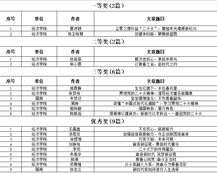 经专家评审、学术委员会审议,我院共有19名学生获奖,成为学生组获奖数量最多的学院。其中夏诗颖同学的《尘雾之微补益二十大,萤烛末光增辉新纪元》、祝王咏慧同学的《回望来时路,擘画新蓝图》获评一等奖,张培森同学的《载济世初心,承百年荣光》、柴小雯同学的《以青春之名,赴时代之约》获评二等奖,姚雯静等6名同学的作品获评三等奖、王晶鑫等9名同学的作品获评优秀奖。