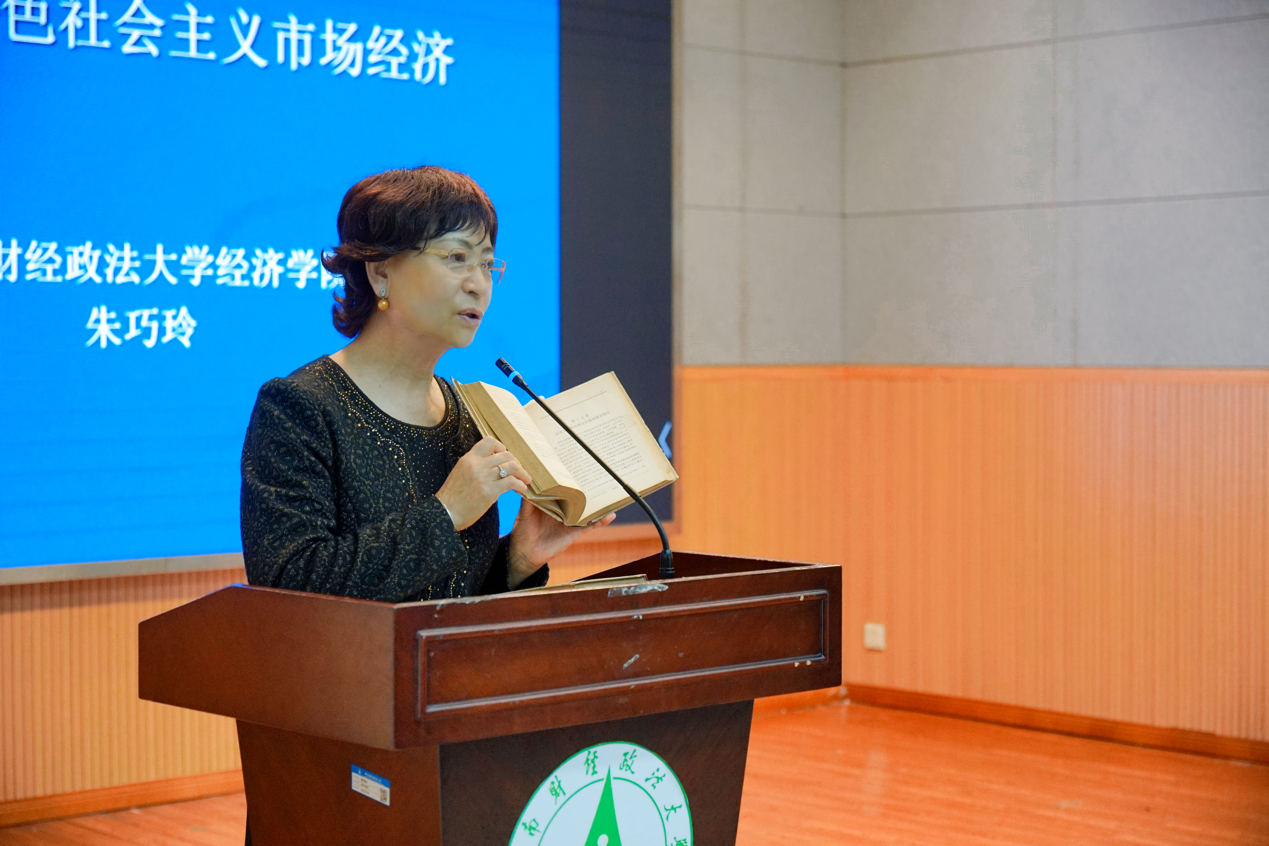 朱巧玲教授以《资本论》与中国特色社会主义市场经济为题,从自己曾经阅读《资本论》的感受入题,深刻分析了资本的本质并分享了学习《资本论》的方法。她引导同学们用“二重性”去学习理解《资本论》,切忌教条主义和本本主义。同时,朱巧玲教授结合中国经济发展现状,运用《资本论》中的理论知识深刻阐述了中国特色社会主义市场经济理论的正确性和指导意义,指导同学们树立正确的价值观、世界观和人生观。朱巧玲教授鼓励同学们学好用好《资本论》,坚定将马克思主义与中国国情相结合,树立远大理想,为中国特色社会主义市场经济贡献自己的力量。朱巧玲教授精彩的演讲一次次将现场的气氛推向高潮。