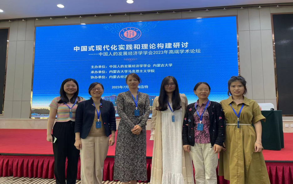 2023724-26日,胡雪萍教授、高红贵教授、张霞教授、王韶华老师一行前往内蒙古呼和浩特,参加了“中国式现代化实践和理论构建研讨会暨中国人的发展经济学学会2023年高端学术论坛”。本次研讨会由中国人的发展经济学学会和内蒙古大学主办,内蒙古大学马克思主义学院承办。来自南京大学、南京师范大学、中南财经政法大学、安徽大学、西南财经政法大学、福建农林大学、内蒙古大学、南京财经大学等20多所高校、科研院所的40多名专家学者参加了此次学术研讨会。