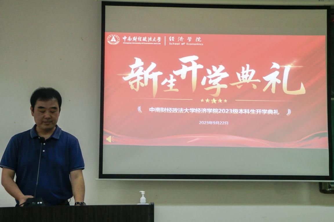 (学生记者李抒谚 张逸飞 摄影何胤良)日征月迈,岁序更新,为了迎接全体2023级本科新生的到来,开启新学期、新征程,经济学院2023级本科生开学典礼于9月22日上午在文润楼303隆重举行。经济学院院长李小平、院党委书记刘刚、副院长张鸿武、院党委副书记俞凡,学院学生工作办公室、各教研室专任教师代表及2023级全体本科生参加本次典礼。典礼由俞凡副书记主持。此次典礼发挥了凝聚新生精神的作用,展现了经济学院独特的人文关怀与文化底蕴。