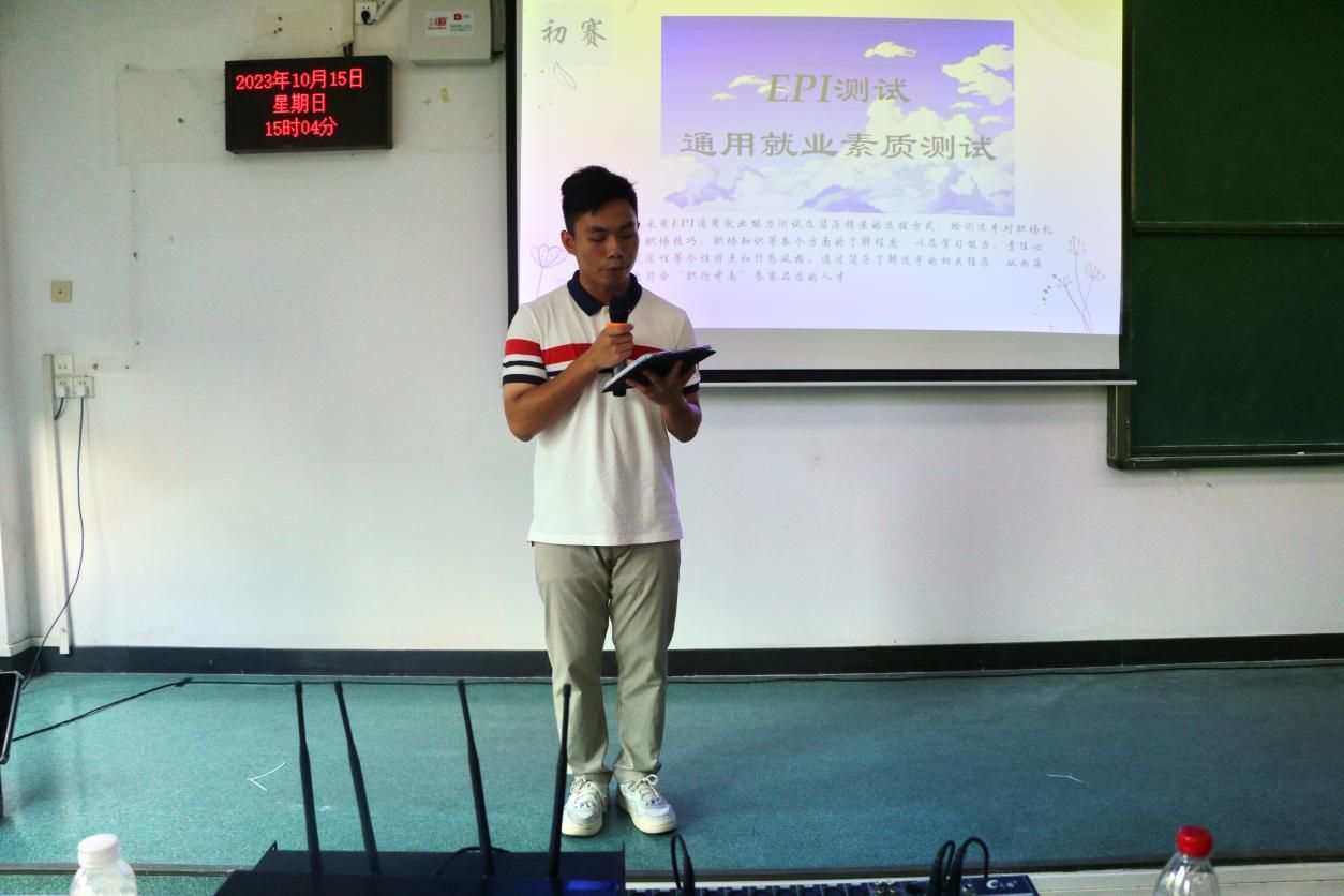 主持人徐磐睿对此次大赛的赛制赛程进行了详细的介绍。本次大赛分为初赛、复赛、决赛三项,初赛将通过通用就业素质测评(即EPI测试)筛选出合格选手,进入复赛参与“无领导小组讨论”,选出决赛选手。最后,决赛选手将在“惊艳登场”“情景模拟”“即兴演讲”三个方面进行竞争,角逐冠军宝座。