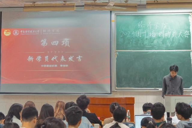 新学员代表李佳轩同学向成员们分享了自己加入团学的喜悦之情,他表示,团学为广大学子提供了一个展示才华的平台,希望能够发扬“中流击水、浪遏飞舟”的蓬勃朝气,发挥善于学习、勤于思考的长处,彰显青年人的担当,展现年轻人的作为,推动经济学院稳步发展,愈来愈好。