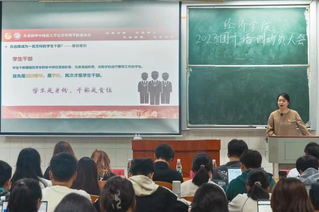(学生记者 胡漪 摄影 何胤良)高扬信念之帆,勇担青年使命。为了带领分团委学生会(以下简称“团学”)成员们熟悉学生工作,增强团学队伍的凝聚力,经济学院“高举团旗跟党走 青春砥砺迸新芽”团干培训动员大会暨培训第一课学习于10月19日下午在首义校区文瀚楼201教室举行。本次培训特邀华中师范大学公共管理学院分团委书记张子规主讲,经济学院分团委书记陈远瞻、团学各部门主要负责人及经济学院2023级团学新学员到场参加培训。