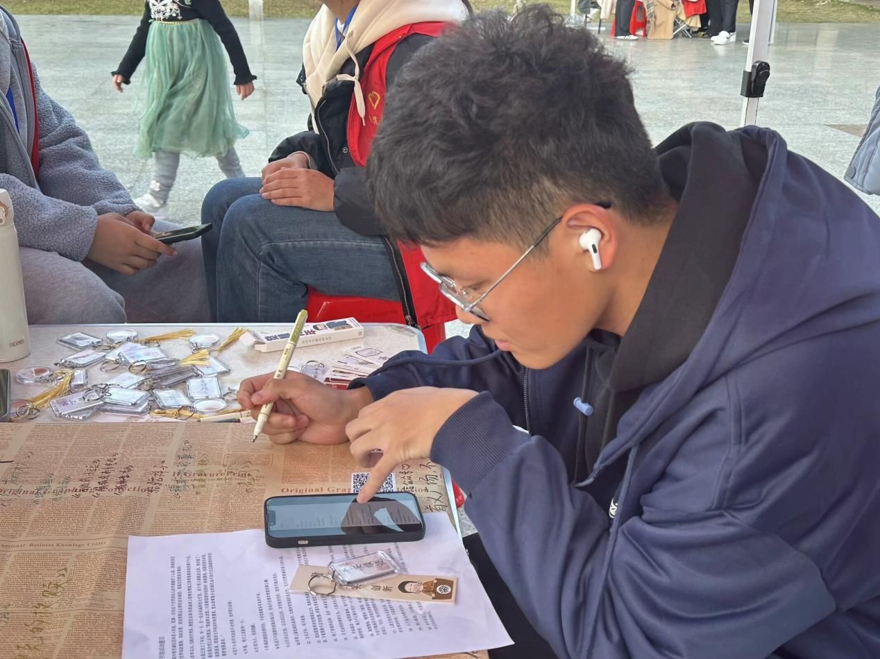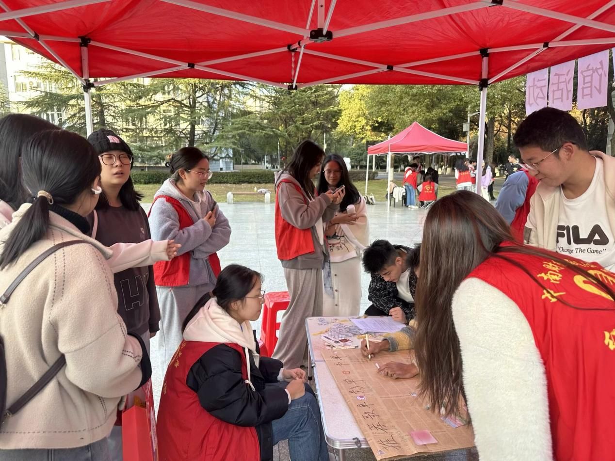 在活动举办期间,装饰精致的分享板吸引了许多路过同学们的注意,他们纷纷来到摊点分享自己心爱的歌单、书单或影单,希望找到能与自己产生共鸣的人。一本本精彩纷呈的书籍、一部部引人入胜的电影、一首首洋洋盈耳的歌曲被写在分享板上,这是思想的交流与碰撞,深刻而深邃。同时,我们的熊本熊也向路过的同学挥着手,招呼更多的同学们来参加这次活动,并向大家发出“爱的抱抱”的邀请,希望能够帮助同学们释放压力。在摊点的另一边,猜书迷活动也在同步进行着。面对名著中的名句,同学们回想自己读过的书,一一答出对应书名,获得奖品。这好似我们与那些名人的对话,跨越国家,穿过时光,能有机会再次领略他们深刻的思想。