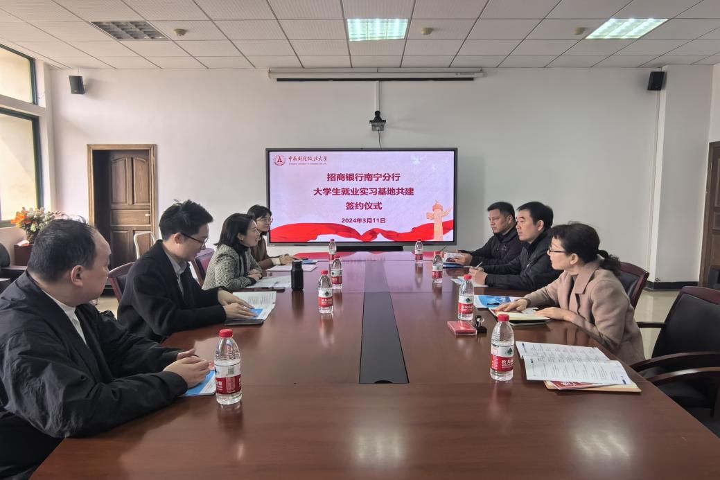 3月11日上午,招商银行南宁分行与乐鱼官方端网站登录入口于文泉楼南207会议室举行了大学生就业实习基地共建签约仪式。招商银行南宁分行人力资源部负责人黄婉莹,人力专员覃献莹,经济学院党委副书记俞凡,经济学系副教授陈立兵、2020级本科生辅导员孟庆红、沈鹏飞出席仪式。