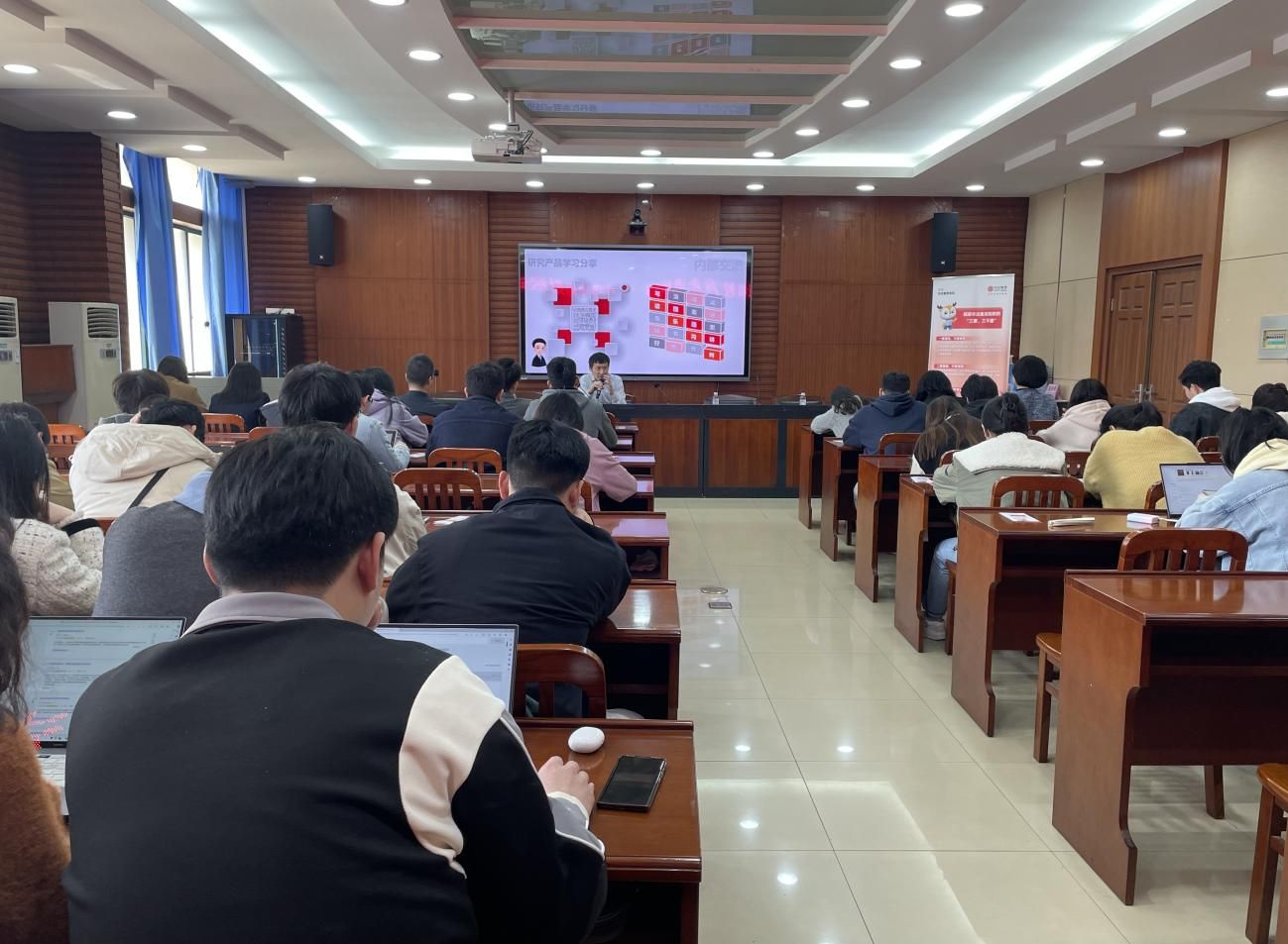 随后,在206会议室,王稹博士在我院青研经英企业家论坛第四期作了主题报告。围绕“期货衍生品市场发展与职业选择方向”的主题,王稹博士为与座学生科普了期货期权的用途,介绍了场外衍生品市场和行业发展程度,从专业视角引导学生对期货行业产生新的认知。结合自身的求学经历、从业经历以及多个领域的研究经历,王稹博士提供了职业选择的个人见解,并以“演讲、思索、沟通、好奇、乐观、研判、运动、读书、图表、写作”十个关键词为索引,鼓励同学们笃行不怠、终身学习,为达到行业门槛、成为行业翘楚不懈努力。针对同学们关于行业工作特点、工作氛围等问题,王稹博士结合当前的经济、行业发展大环境予以一一解答,得到了现场学生的高度认同。讲座在热烈的掌声中圆满结束。