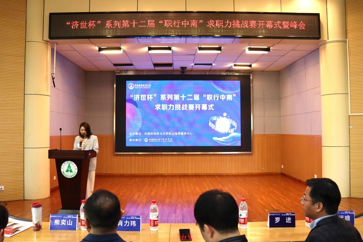 (学生记者 段雨庭 摄影 李抒谚)为提升在校学生的求职技能、沟通技巧和团队协作能力,协助同学们做好职业规划,经济学院“济世杯”系列之第十二届“职行中南”求职力挑战赛于3月31日上午在我校南湖校区文潭楼报告厅成功开幕。本次比赛由中南财经政法大学就业指导服务中心主办,经济学院分团委承办。中南财经政法大学就业指导服务中心就业育人办公室主任肖力玮老师,武汉万企智荟管理顾问有限公司项目总经理、“武汉HR智享之家”创始人罗进老师受邀担任本次会议分享嘉宾,经济学院党委副书记俞凡、分团委书记陈远瞻及来自多个学院、多个年级的同学到场参加开幕式。