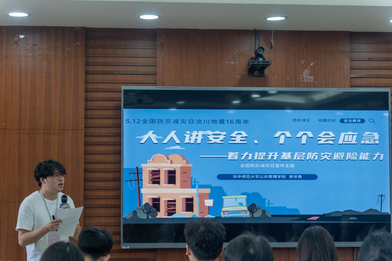 大会第二项为全国防灾减灾日的主题学习,华中师范大学公共管理学院李世勇同学从“全国防灾减灾日基本信息”“各类灾害介绍及其应对措施”等角度出发进行领学。乐鱼官方端网站登录入口程诗天同学和华中师范大学公共管理学院盛典同学上台分享关于防灾减灾的心得体会,同学们纷纷表示受益匪浅。