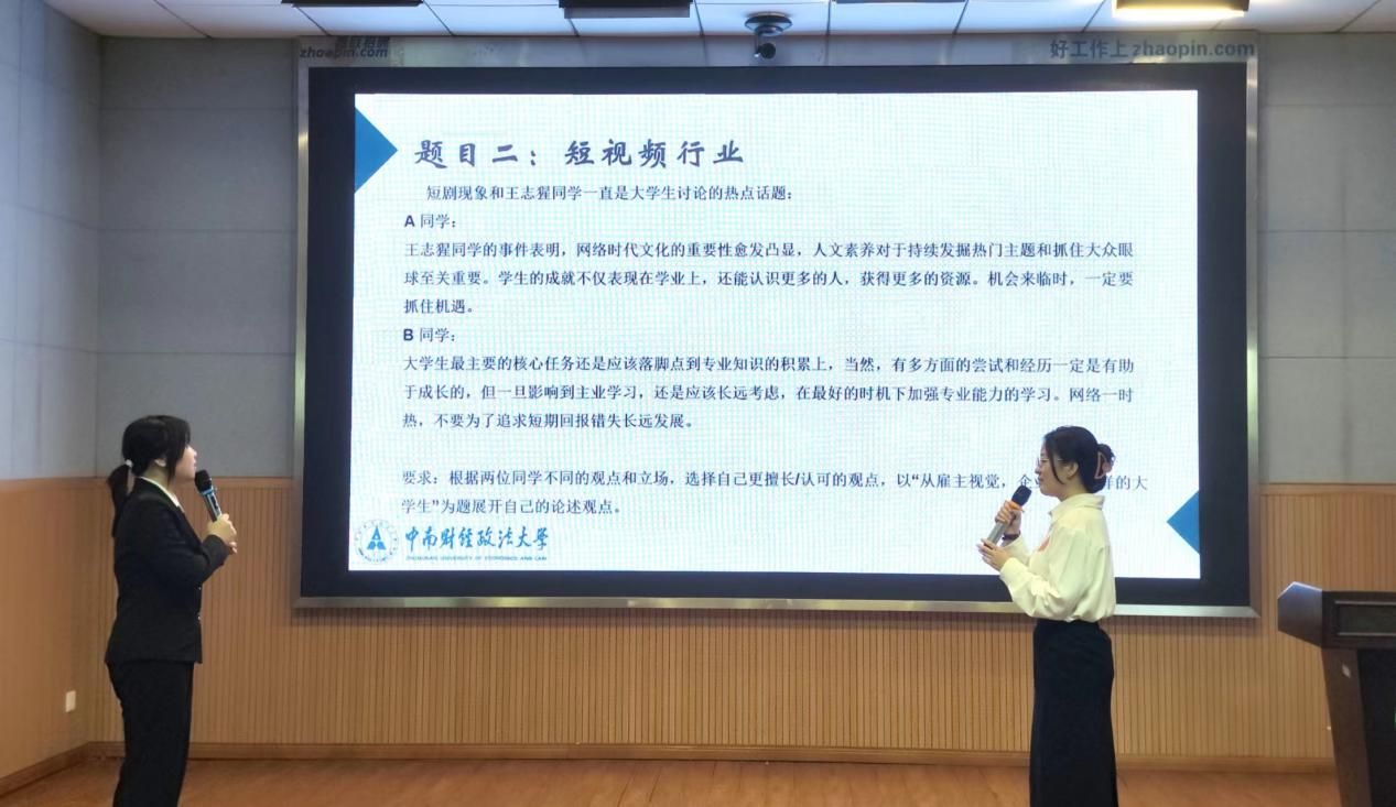 在“惊艳登场 、沉着应答”环节,各位选手结合试题要求,通过趣味VCR与限时竞职演说的方式,展示自身独特风采;压力面试真实模拟了职场招聘过程,面对评委的多角度提问,选手们从自身优势出发,流利对答,从容应对。