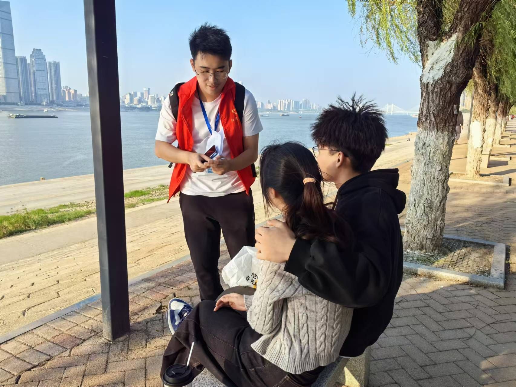 在接下来的三个小时里,志愿者们分为三组:第一组成员负责与行人互动,通过问答的形式普及长江环保知识;第二组成员引导行人写下对环保活动的看法和保护长江保护环境的宣传标语;第三组成员负责用易拉宝海报流动宣传,引导行人加入环保行动,并在海报上签名打卡。各组志愿者协调沟通,通力合作;江滩边上的行人也积极配合,主动参与。今日的长江见证了问答时一张张求知的面孔;听见了一句句“长江真美啊”“长江,我爱你”的深情赞美;感受到了“保护长江,人人有责”的责任担当。阳光之下,波光粼粼,被风激起的阵阵江水似乎在回应她岸上子民的呼唤。她一定知道,中华儿女一直深爱着祖国的母亲河,一直在用行动保护着她。“凝聚志愿力量,共绘绿色长江”绝不是镜中花、水中月,而是一代代中华儿女用实际行动证明的誓言、践行的使命。