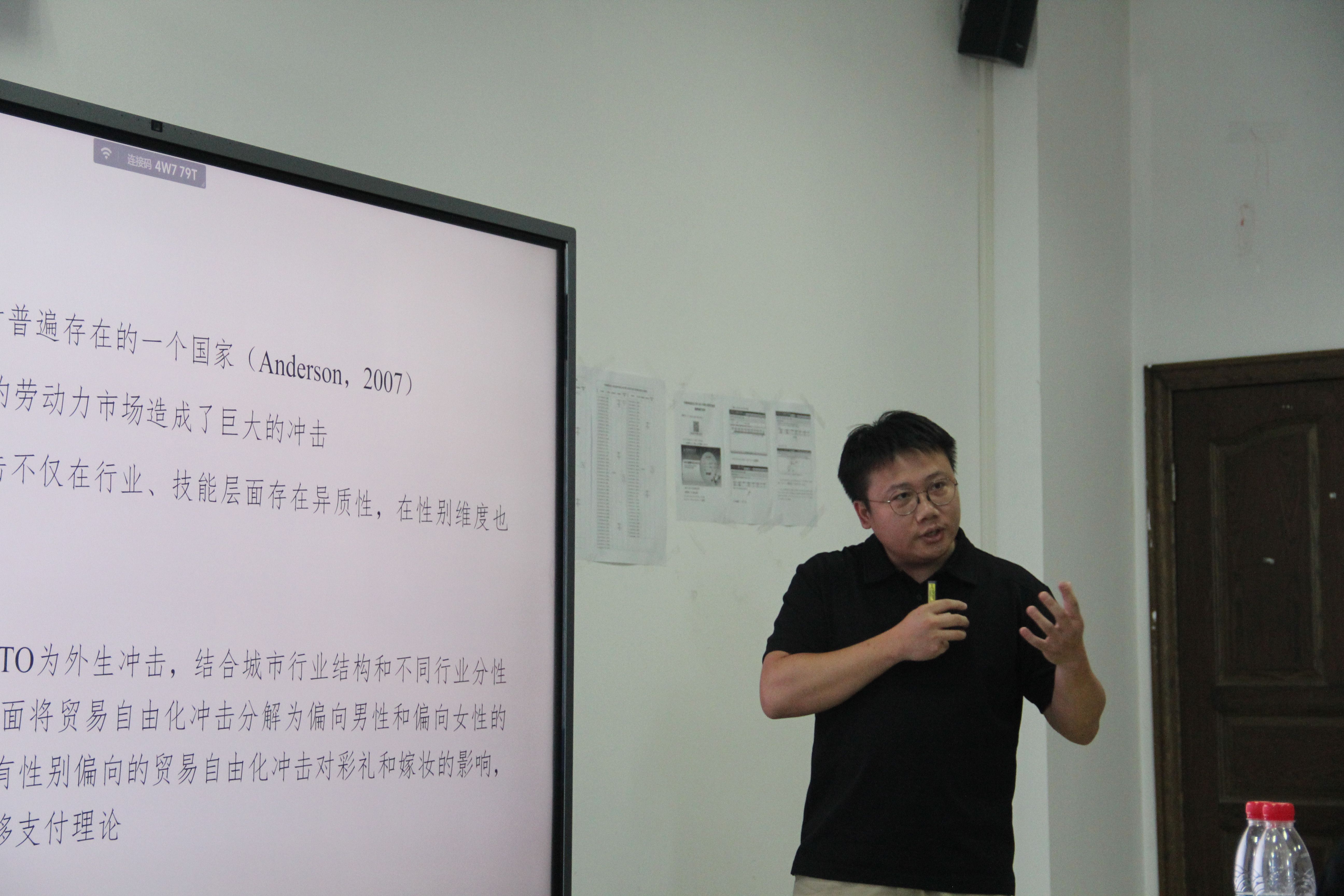 最后,中南财经政法大学万千副教授分享了题为《检验婚姻转移支付理论:基于中国贸易自由化的经验研究》的报告。万千副教授基于彩礼和嫁妆在中国普遍存在的现实情况,基于三大主流婚姻转移支付理论检验了贸易自由化与婚姻嫁妆的因果关系,从偏向男性与偏向女性的贸易自由等多重视角分析了对婚姻市场的影响。本研究为中国社会家庭关系与婚姻市场提供了有趣且重要的理论基础。在交流环节,与会师生针对关税贸易壁垒、贸易自由化冲击时间、样本数据年限、彩礼归属问题的异质性、经济学与社会学的互补结合等问题展开了深入讨论。