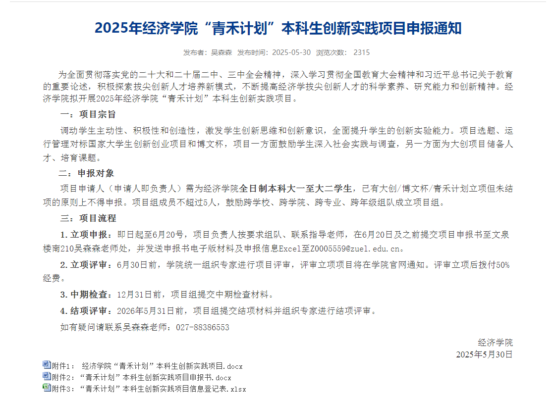 学院积极探索拔尖创新人才培养新模式,不断提高经济学拔尖创新人才的科学素养、研究能力和创新精神,开展2025年经济学院“青禾计划”本科生创新实践项目。项目面向学院大一至大二学生,通过竞赛培养学生的创新意识与实践能力。